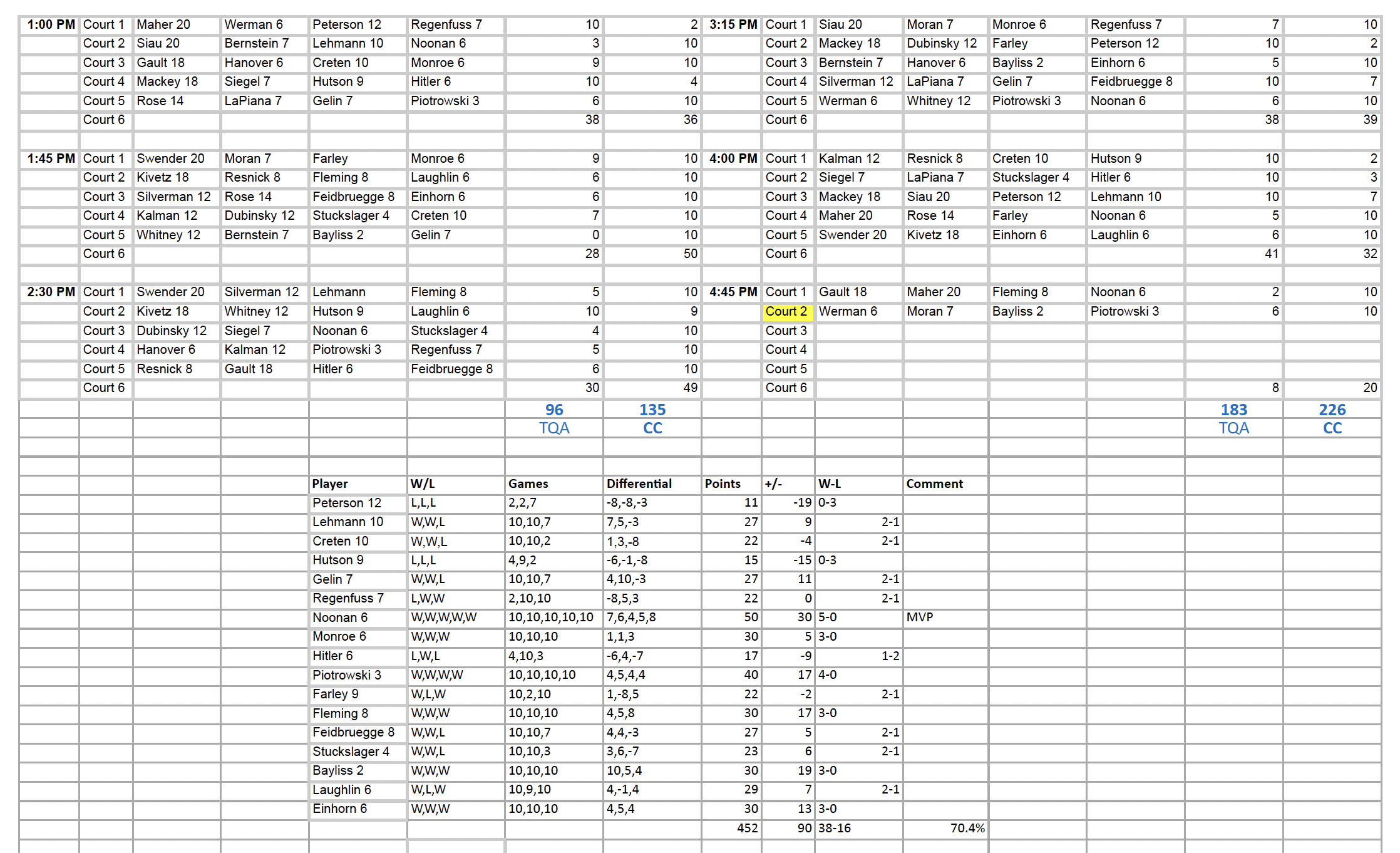 The MVP of the series was none-other-than-the-mild-mannered Daniel Noonan, who’s stamina to play and win 5 matches with 5 different partners added 50 points to the TCC team score! Followed closely by Nick Piotrowski’s 4 win (40 point) effort and Matt Monroe, John-Michael, Andrew Bayliss and Dan Einhorn who also went undefeated in 3 matches.